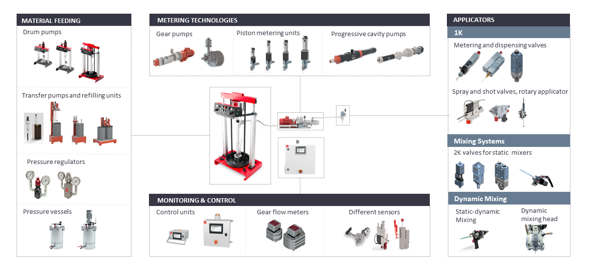 依托我们种类繁多的高品质元件,我们能够根据您的特定应用需求提供更精准的定量涂胶和混胶系统。我们将根据规格和待处理的材料,使用柱塞泵、齿轮泵或螺杆泵。我们提供适用于单组分和双组分润滑油、粘合剂、密封胶、灌封胶和发泡密封胶的定量涂胶、混胶和涂覆的解决方案。我们以最大热情投身我们所从事的事业中,致力于为您找到更好的解决方案。